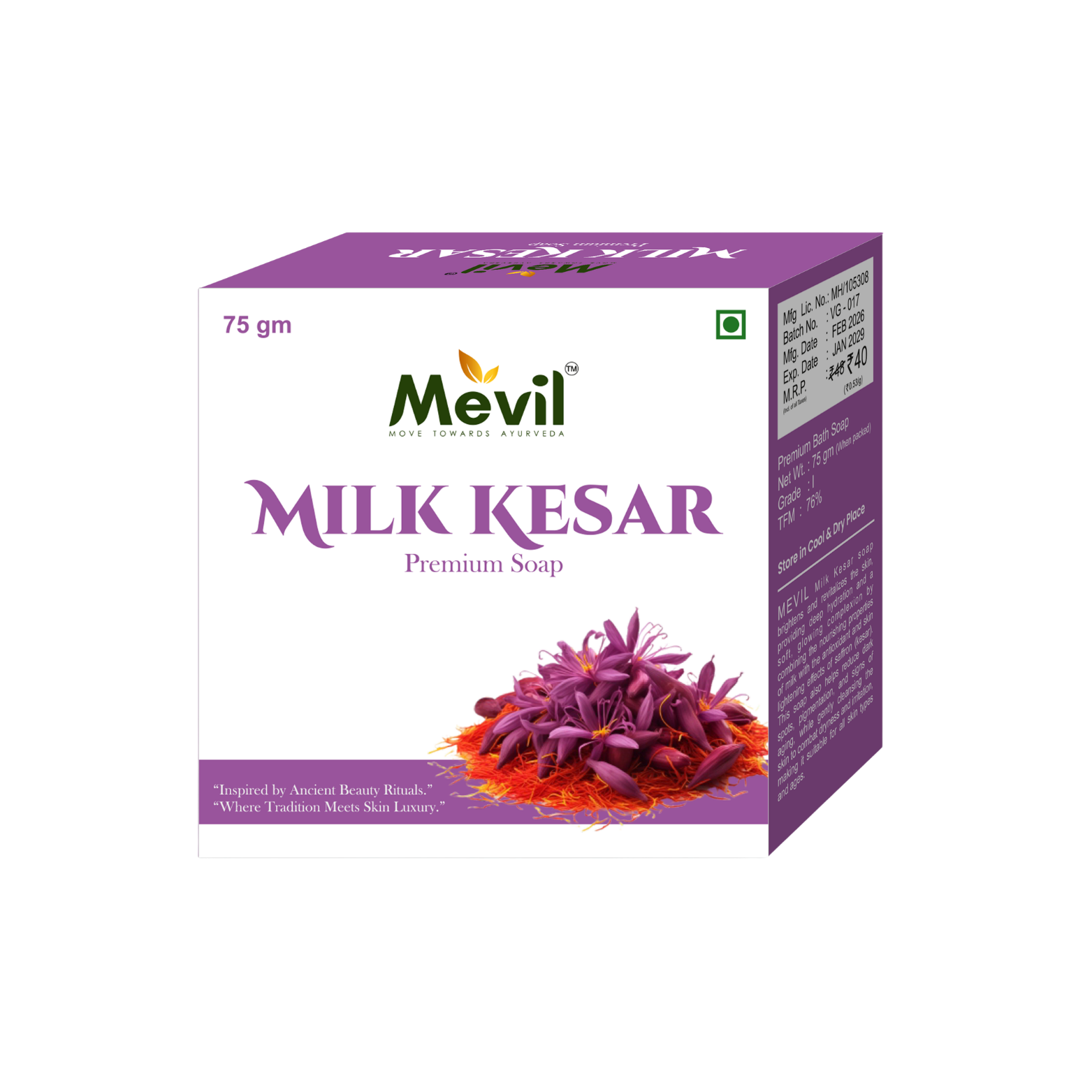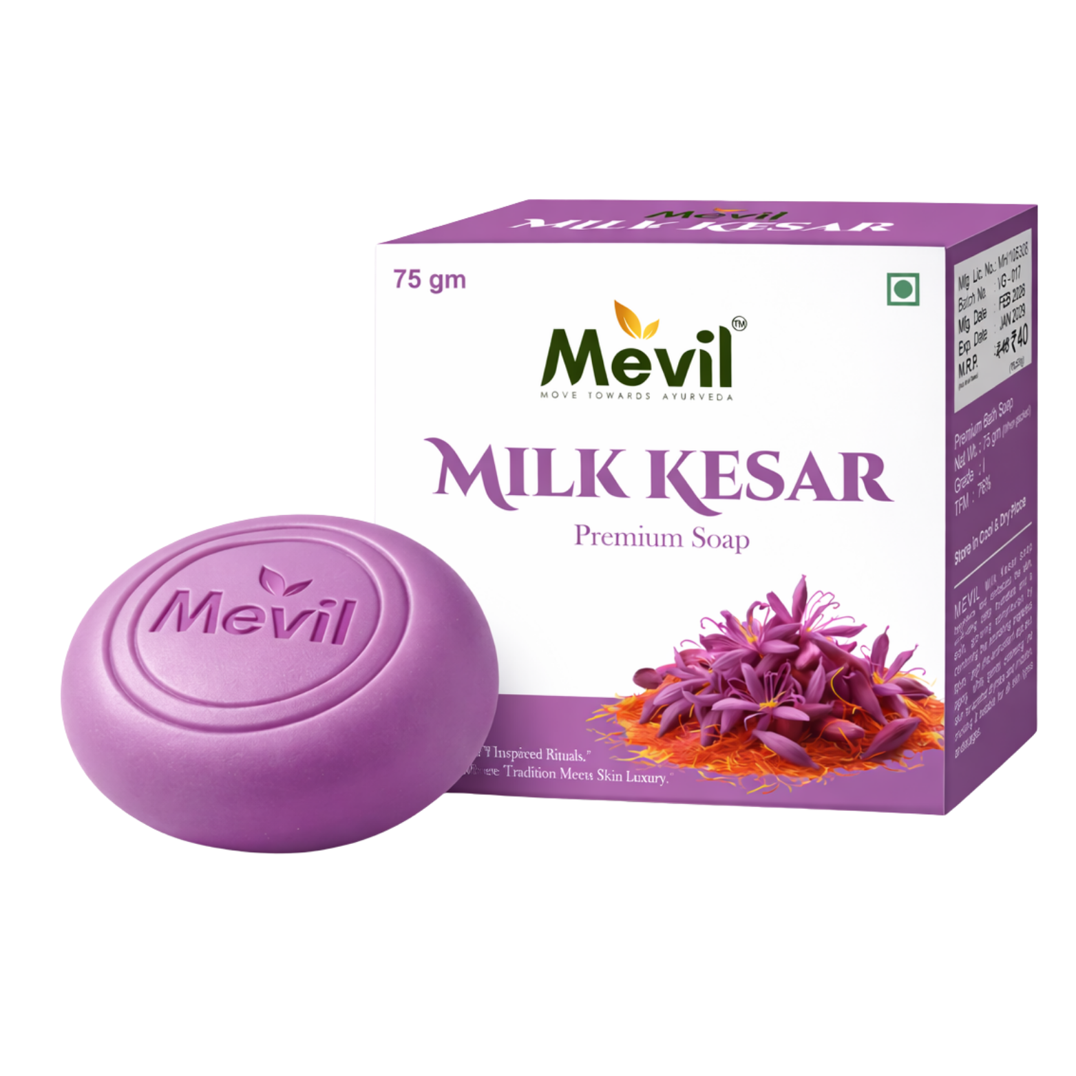 Mevil Milk Kesar Soap is crafted with the nourishing goodness of milk and the natural glow-enhancing properties of saffron (kesar). It gently cleanses the skin while helping maintain softness, hydration, and a radiant glow. Perfect for everyday use to keep your skin fresh, smooth, and naturally bright.